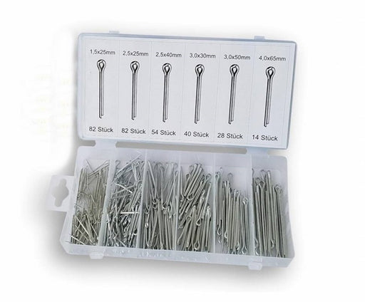 Splitpen assortiment, 300 stuks in opbergbox. bestaande uit: 82x 1,5x25mm, 2,5x25mm, 54x 2,5x40mm, 40x 30x30mm, 28x 3x50mm, 14x 4x65mm